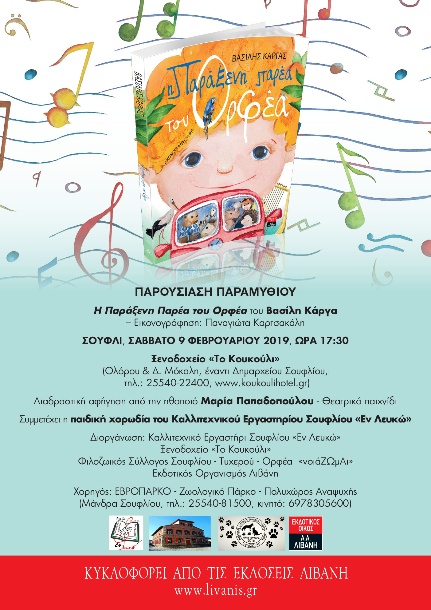 Το παραμύθι του δημοσιογράφου Βασίλη Κάργα, «Η Παράξενη Παρέα του Ορφέα», που κυκλοφορεί από τον Εκδοτικό Οργανισμό ΛΙΒΑΝΗ, θα παρουσιασθεί στο Σουφλί (Ξενοδοχείο Το Κουκούλι), το Σάββατο 9 Φεβρουαρίου και ώρα 5.30 το απόγευμα.