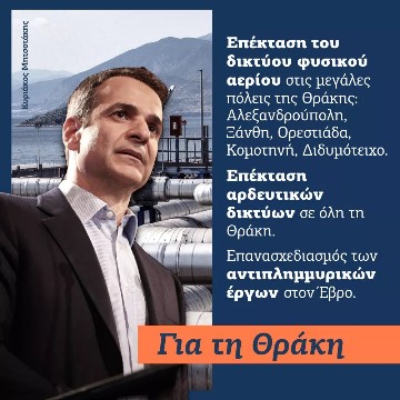 Αρδευτικά έργα, αντιπλημμυρική θωράκιση αλλά και επέκταση του δικτύου φυσικού αερίου και στο Διδυμότειχο υπόσχεται μεταξύ άλλων ο πρόεδρος Νέας Δημοκρατίας Κυριάκος Μητσοτάκης. «Έχουμε συγκεκριμένο σχέδιο για τη Θράκη που βάζει σε προτεραιότητα την αναβάθμιση των υποδομών και των δικτύων. Είναι καιρός να δώσουμε έμφαση στα έργα που έχει πραγματικά ανάγκη αυτός ο τόπος», αναφέρεται σε διαφημιστική καταχώρηση της Νέας Δημοκρατίας για τη Θράκη.