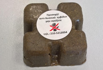 Φέρει αυτοκόλλητο με εμφανή προειδοποίηση, ΠΡΟΣΟΧΗ ΑΝΤΙΛΥΣΣΙΚΟ ΕΜΒΟΛΙΟ – ΜΗΝ ΑΓΓΙΖΕΤΕ και το τηλέφωνο 210-5212054 του Κέντρου Ελέγχου και Πρόληψης Νοσημάτων (ΚΕΛΠΝΟ)
