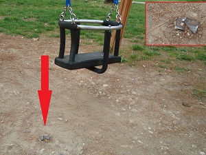 Σπασμένες πλάκες, λόγω των οποίων πέφτουν παιδιά κι ένα κομμάτι σίδερο ανάμεσα σε κούνιες.