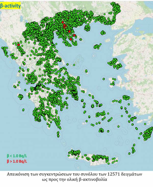Στο χάρτη με την ολική β-ακτινοβολία δεν εντοπίζονται «κόκκινα σημεία» στην βορειοανατολική Ελλάδα (εδώ το όριο είναι 1 BQ/L).