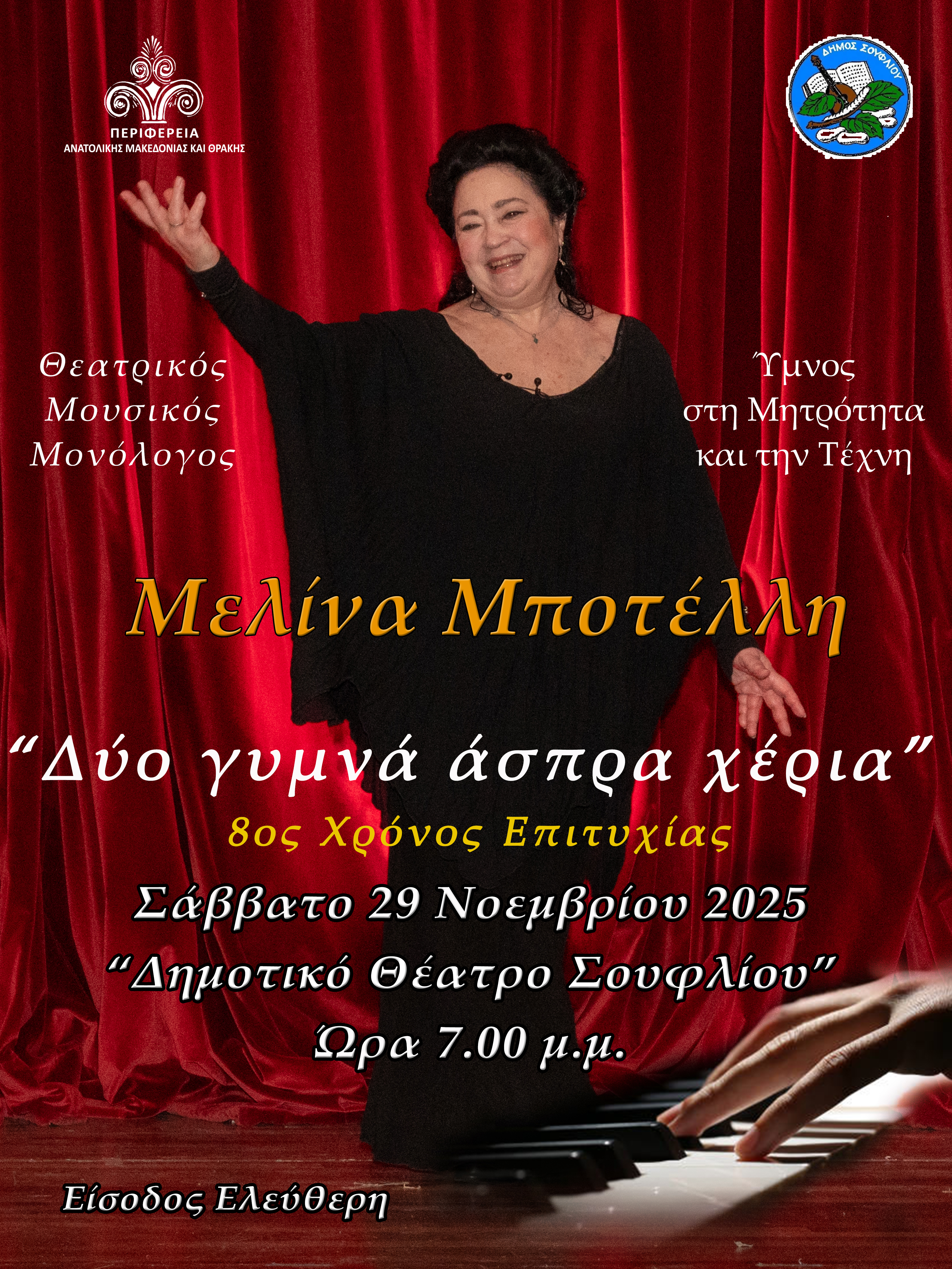 Η Περιφέρεια Ανατολικής Μακεδονίας και Θράκης, σε συνεργασία με τον Δήμο Σουφλίου, παρουσιάζουν τη σπουδαία ηθοποιό Μελίνα Μποτέλλη στο θεατρικό μουσικό της μονόλογο «Δύο γυμνά άσπρα χέρια», το Σάββατο 29 Νοεμβρίου 2025, στις 7:00 το απόγευμα, στο Δημοτικό Θέατρο Σουφλίου.
