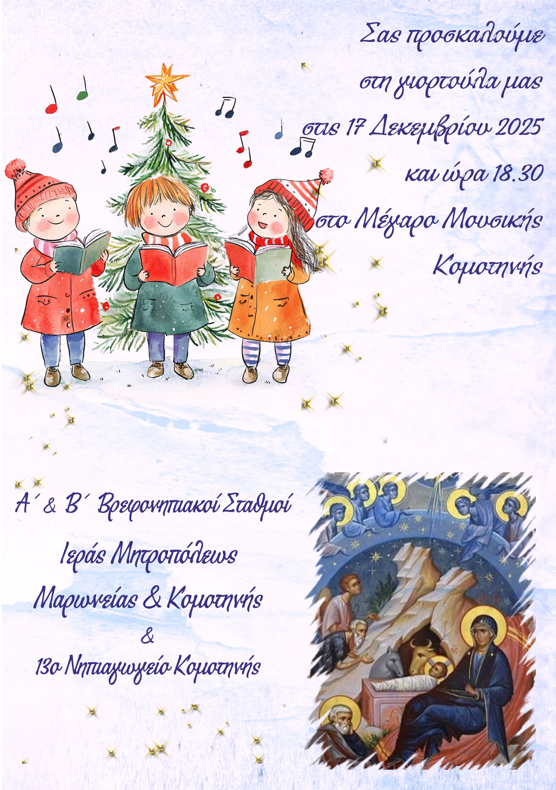 Την Τετάρτη, 17 Δεκεμβρίου 2025 και ώρα 18.30, θα πραγματοποιηθεί η Χριστουγεννιάτικη γιορτή από τα παιδιά των Βρεφονηπιακῶν Σταθμῶν της Ιεράς Μητροπόλεως Μαρωνείας & Κομοτηνής και του 13ου Νηπιαγωγείου Κομοτηνής, στο Μουσικό Μέγαρο Κομοτηνής.
