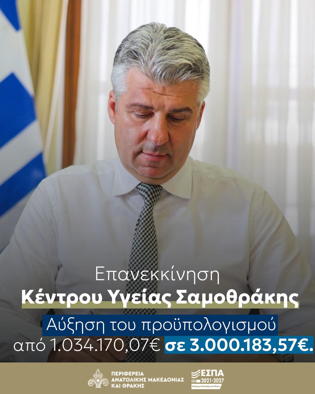 Ο Περιφερειάρχης Ανατολικής Μακεδονίας και Θράκης, Χριστόδουλος Τοψίδης, υπέγραψε την απόφαση επανεκκίνησης του έργου «Αναβάθμιση Υποδομών και Εξοπλισμού του Κέντρου Υγείας Σαμοθράκης», ενός έργου κομβικής σημασίας για την ενίσχυση της δημόσιας υγείας σε μια ακριτική νησιωτική περιοχή.