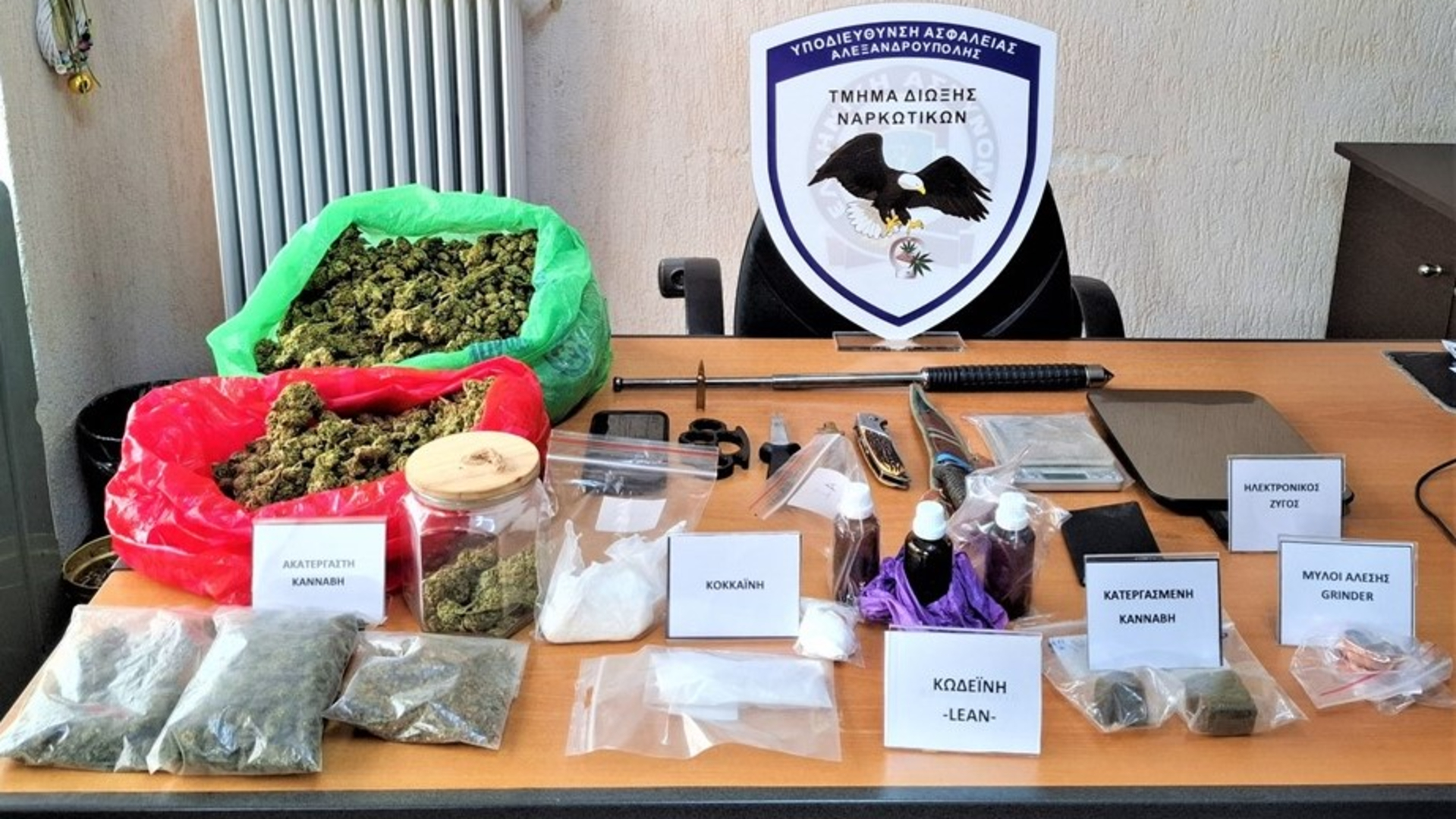 -3- νάιλον συσκευασίες με κοκαΐνη, συνολικού βάρους -114,8- γραμμαρίων -2- νάιλον συσκευασίες με κατεργασμένη κάνναβη (σοκολάτα), συνολικού βάρους -53,-1- γραμμαρίων -1- γυάλινο βάζο και -5- νάιλον συσκευασίες με ακατέργαστη κάνναβη, συνολικού βάρους -1- κιλού και -486,9- γραμμαρίων -2- ηλεκτρονικές ζυγαριές ακριβείας, -1- μεταλλικό τρίφτη, -3- γυάλινα φιαλίδια με ναρκωτική ουσία «lean» συνολικού όγκου, -110- ml, -1- μεταλλική ράβδος, -1- σιδερογροθιά και -4- μαχαίρια.
