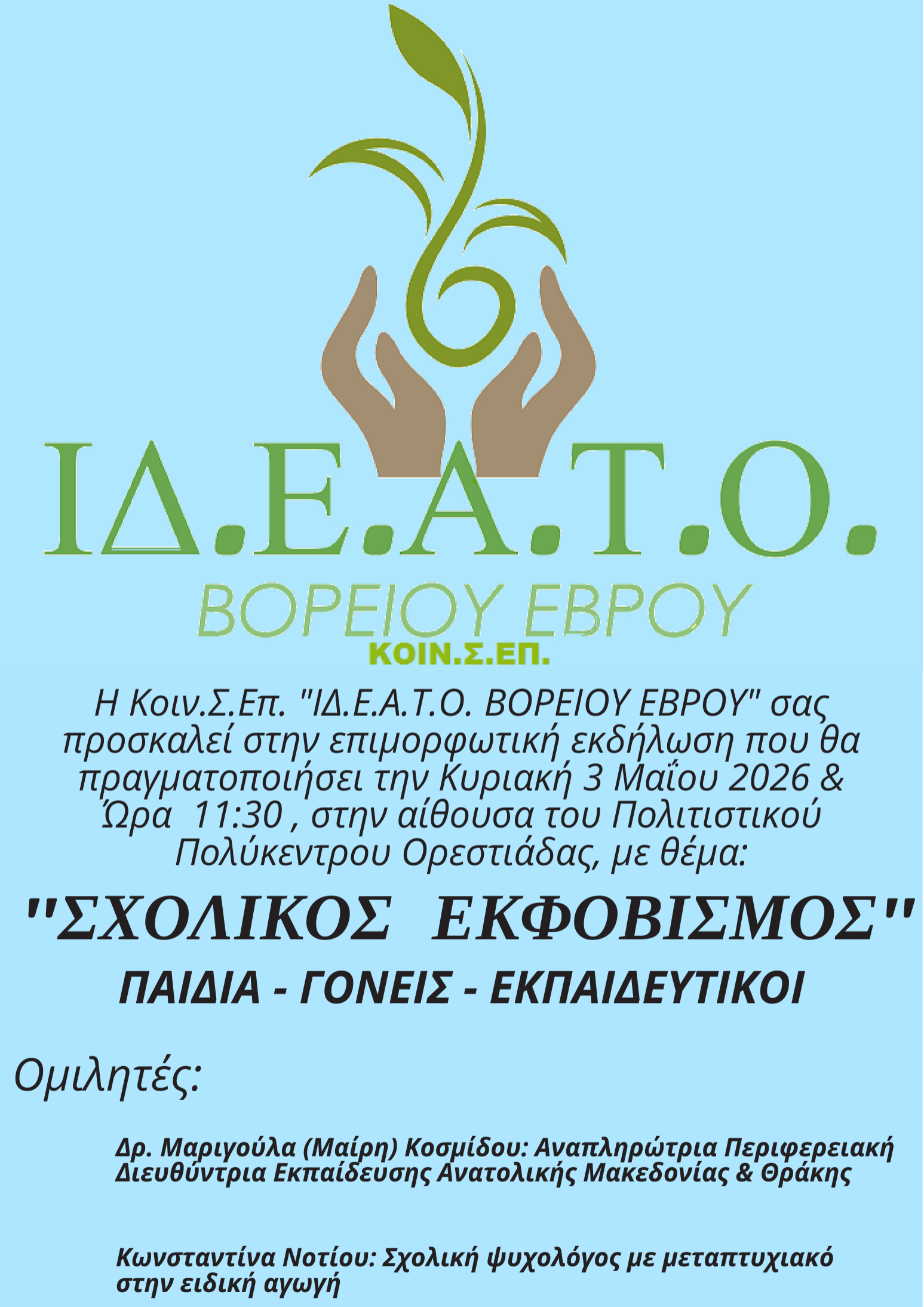 Η Κοιν.Σ.Επ. «ΙΔ.Ε.Α.Τ.Ο. ΒΟΡΕΙΟΥ ΕΒΡΟΥ» διοργανώνει επιμορφωτική εκδήλωση την Κυριακή 03 Μαΐου 2026 στις 11:30, στην αίθουσα του Πολιτιστικού Πολύκεντρου Δήμου Ορεστιάδας, με θέμα: «ΣΧΟΛΙΚΟΣ ΕΚΦΟΒΙΣΜΟΣ» ΠΑΙΔΙΑ – ΓΟΝΕΙΣ – ΕΚΠΑΙΔΕΥΤΙΚΟΙ