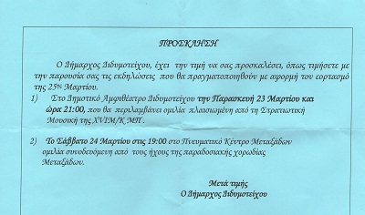 Το thraki Νεα, επικοινώνησε με το Δήμαρχο Διδυμοτείχου, ο οποίος υποστήριξε ότι η πρόσκληση μοιράζεται γιατί ο δήμος διοργανώνει την εκδήλωση στους Μεταξάδες και δε θα μπορούσε να κάνει αλλιώς.
