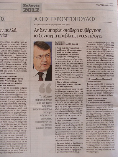 Συνέντευξη του Άκη Γεροντόπουλου στην εφημερίδα «Τα Νέα»