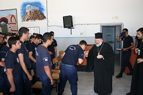 Το Σεβασμιώτατο υποδέχτηκε ο Διοικητής της σχολής Πασχάλης Συριτούδης και στη συνέχεια ο ιεράρχης επικοινώνησε για ένα δίωρο περίπου με τους αυριανούς αστυνομικούς, αναπτύσσοντάς τους τον πνευματικό ρόλο της Εκκλησίας στις δύσκολες αυτές στιγμές της ελληνικής κοινωνίας.