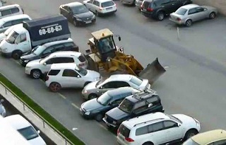 Το δραματικό βίντεο που αναρτήθηκε χθες στο YouTube δείχνει ένα σαφώς μεθυσμένο Ρώσο οδηγό μπουλντόζας να πέφτει πάνω σε παρκαρισμένα αυτοκίνητα με το τεράστιο όχημα του.