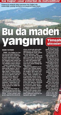 Οι τελευταίες ειδήσεις από την Τουρκία είναι ότι εμμέσως πλην σαφώς, οι Τουρκικές εφημερίδες κατηγορούν τις εταιρείες χρυσού για τις φωτιές του φετινού καλοκαιριού στα Όρη Kaz, στη χερσόνησο Biga (σημερινό όνομα της χερσονήσου της Τρωάδας, απέναντι από τη Λέσβο).