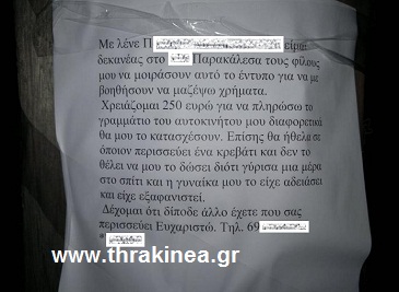Σύμφωνα με ανακοίνωση που έχει κολλήσει άγνωστος σε κολώνες, στρατιωτικός ζητάει επειγόντως 250 € προκειμένου να πληρώσει τη δόση για το αυτοκίνητό του για να μην το κατασχέσουν. Ο στρατιωτικός που δίνει πλήρη στοιχεία για την ταυτότητά του, πέρα των άλλων, αναφέρει στην ανακοίνωση ότι από το σπίτι έφυγε και η γυναίκα του. Για το λόγo αυτό ζητάει ένα κρεβάτι κι ότι άλλο περισσεύει από κάποιον, προκειμένου να στήσει το νέο νοικοκυριό του.