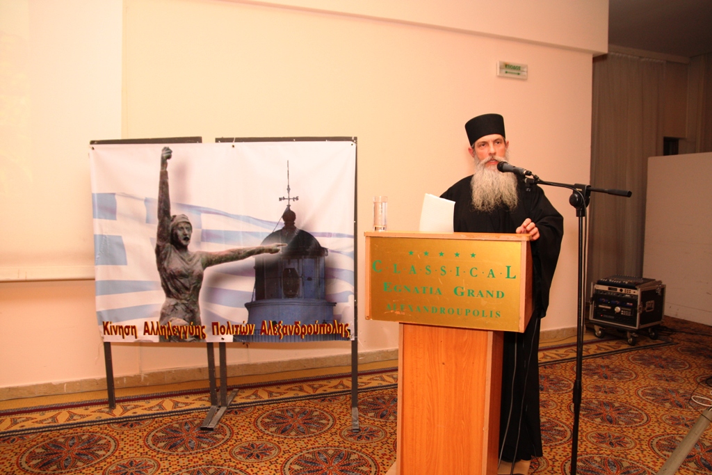 Ο επόμενος ομιλητής,  μοναχός  Αρσένιος Βλιαγκόφτης, αναφέρθηκε στην πνευματική διάσταση της κρίσης και πρότεινε το πρότυπο των Ελληνικών κοινοτήτων, το εμείς του Μακρυγιάννη, που στήριξε την ρωμαίικη παράδοση στο πέρασμα των ετών, ενώ έδωσε το μήνυμα της ελπίδας για το πέρασμα σε μία κοινωνία αγάπης προς το πρόσωπο, σε μία κοινωνία πραγματικής αλληλεγγύης.