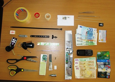 • Διάφορα εργαλεία (μεταλλικά ελάσματα, τσιμπίδες, ψαλίδια κ.α.), τα οποία χρησιμοποίησαν οι δράστες για την τοποθέτηση του μηχανισμού υποκλοπής