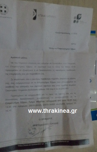 Επιστολές ότι χρωστούν συνδρομές λαμβάνουν επαγγελματίες, μέλη του επιμελητηρίου Έβρου από το επιμελήτήριο. Στις επιστολές αναφέρεται ρητά ότι οι επαγγελματίες πρέπει να τακτοποιήσουν, με εξόφληση ή διακανονισμό τις οφειλές τους μέχρι το τέλος Μαϊου, διαφορετικά οι οφειλές θα βεβαιωθούν στην εφορία όπως προβλέπει ο νόμος.